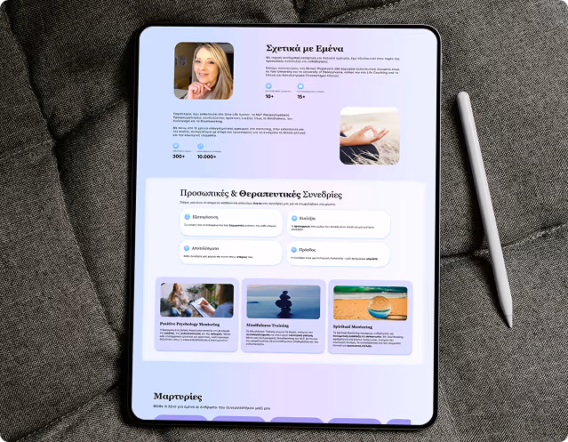 Δημιουργήσουμε μια καθαρή, φιλόξενη landing page για υπηρεσίες θετικής ψυχολογίας, διαλογισμού και ρέικι. Θέλαμε να αναδείξουμε τον χαρακτήρα της, να φιλοξενήσουμε μαρτυρίες πελατών και να περιγράψουμε τις υπηρεσίες με σαφήνεια.